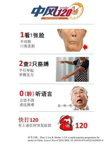 中國推出了適合國人的急性卒中快速識別方法即“中風(fēng)120”,是一種適用于國人的迅速識別腦卒中和即刻行動的策略: