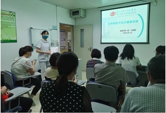 此外,在5月25日上午10:30,神內(nèi)一區(qū)還在健康教育室里開(kāi)展了健康講座。腦心健康管理師葉秀嫻護(hù)士為住院患者及家屬詳細(xì)講解了中風(fēng)相關(guān)健康知識(shí),如中風(fēng)的主要病因,中風(fēng)發(fā)生時(shí)的癥狀,中風(fēng)的預(yù)防、急救,以及教導(dǎo)中風(fēng)患者該如何合理用藥等。前來(lái)聽(tīng)講座的患者及家屬均表示受益良多。