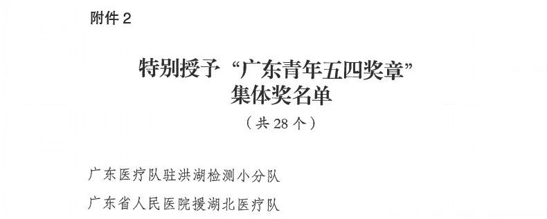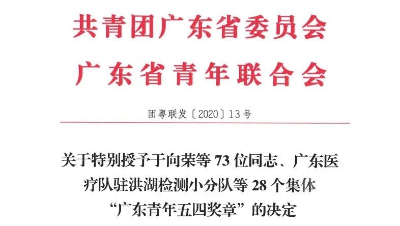 2020年5月19日,為表彰我省優(yōu)秀青年在疫情防控工作中的杰出貢獻(xiàn),更好發(fā)揮優(yōu)秀青年的引領(lǐng)模范作用,共青團(tuán)廣東省委員會(huì)、廣東省青年聯(lián)合會(huì)決定,特別授予全省73位同志及28個(gè)集體“廣東青年五四獎(jiǎng)?wù)隆?。其中?/span>