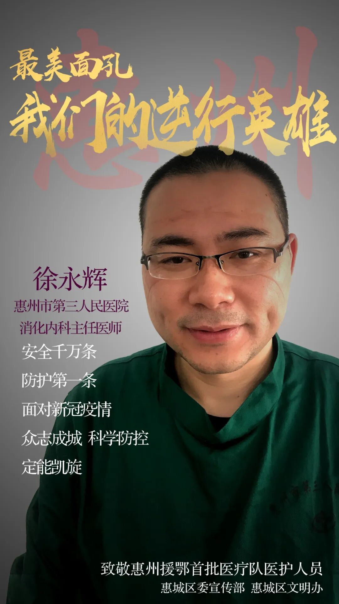徐永輝,男,1978年11月出生,江西鄱陽人,漢族,中共預備黨員,大學本科學歷,現(xiàn)任惠州市第三人民醫(yī)院消化內(nèi)科主任助理,內(nèi)鏡中心負責人、主任醫(yī)師。惠州市第一批援鄂醫(yī)療隊隊長。