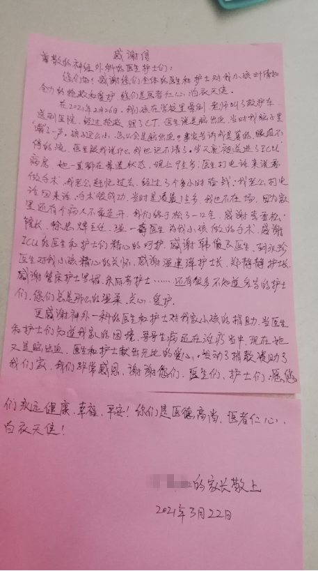 為了表達對醫(yī)護人員的感恩之情,小倩媽媽特意送來一封感謝信。語言樸實無華,卻讓醫(yī)護人員看到了醫(yī)患之間的真誠與和諧,更是一種鞭策和鼓勵。