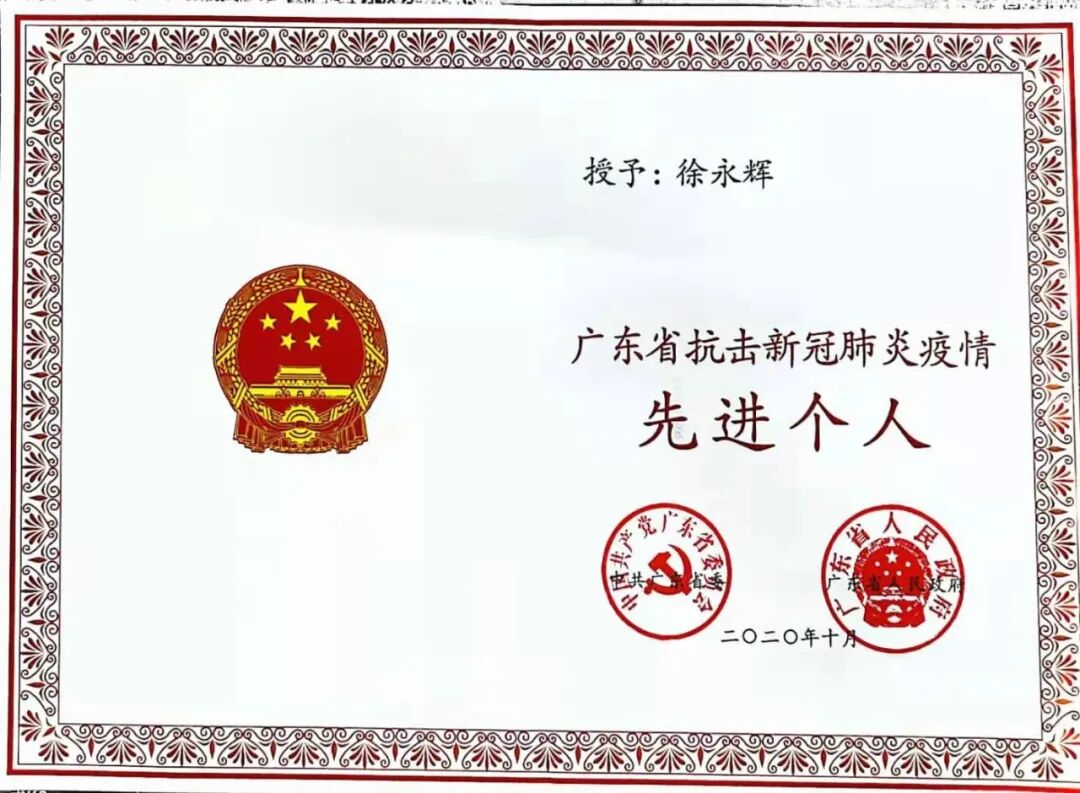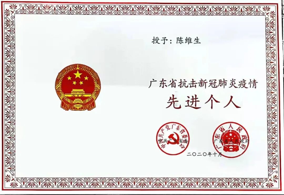 2020年10月,陳維生、徐永輝被授予“廣東省抗擊新冠肺炎疫情先進(jìn)個(gè)人”榮譽(yù)稱號(hào)!