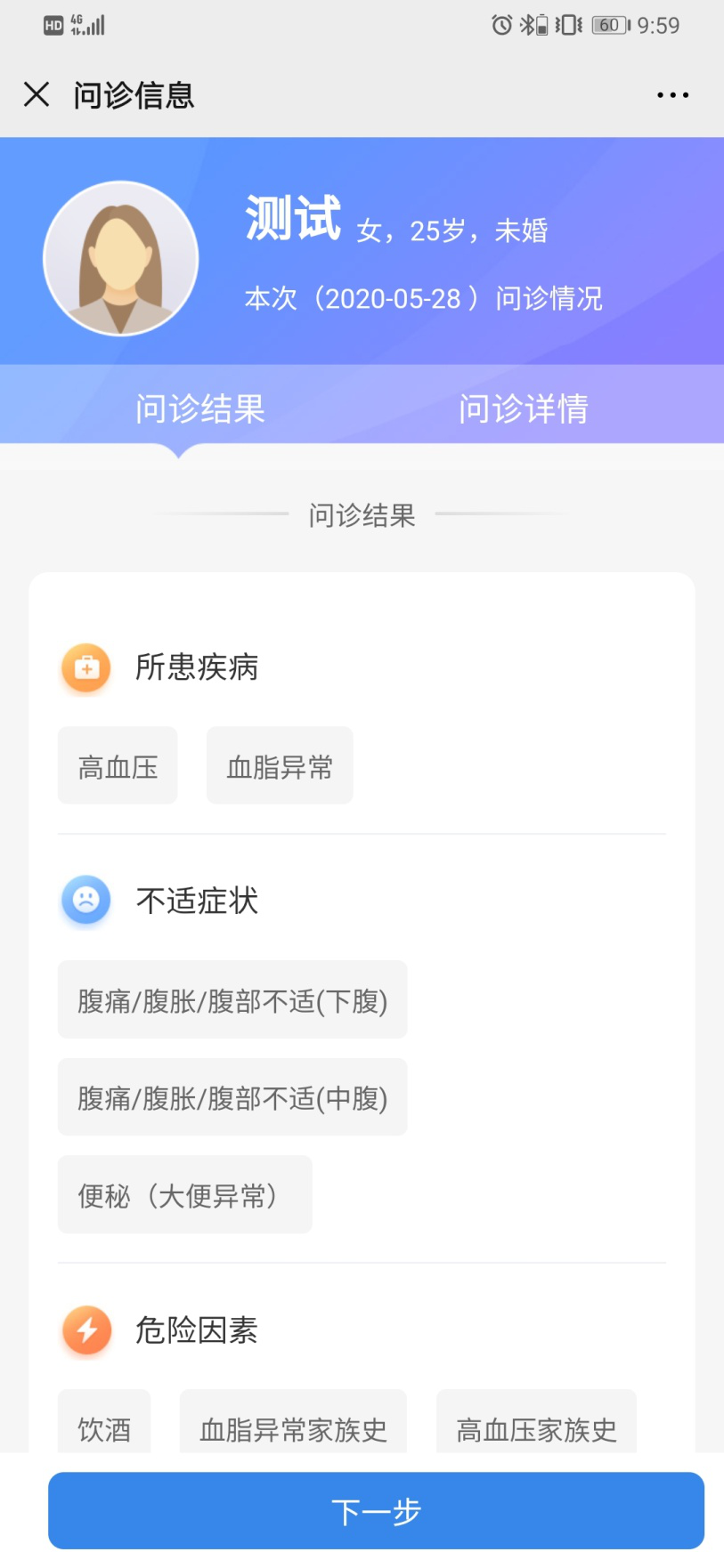 溫馨提示:為確保專家團(tuán)隊(duì)為您精準(zhǔn)制定專屬體檢方案,并篩查潛在的健康風(fēng)險,同時避免過度檢查或漏查,請您務(wù)必提前如實(shí)填寫個體化智能健康管理問診問卷信息。健康管理專家將以問卷信息結(jié)合體檢結(jié)果形成的綜合分析,為您提供精準(zhǔn)的體檢結(jié)論及健康促進(jìn)方案。