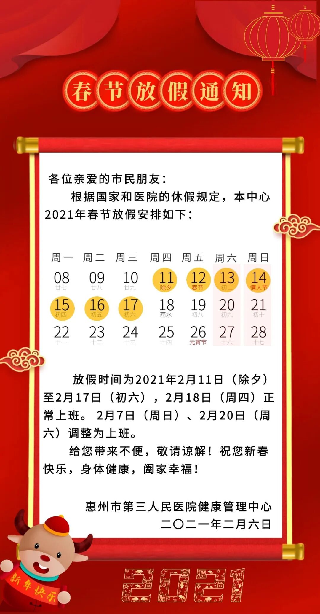 惠州三院健康管理中心2021年2月11日—2月17日暫停健康體檢!