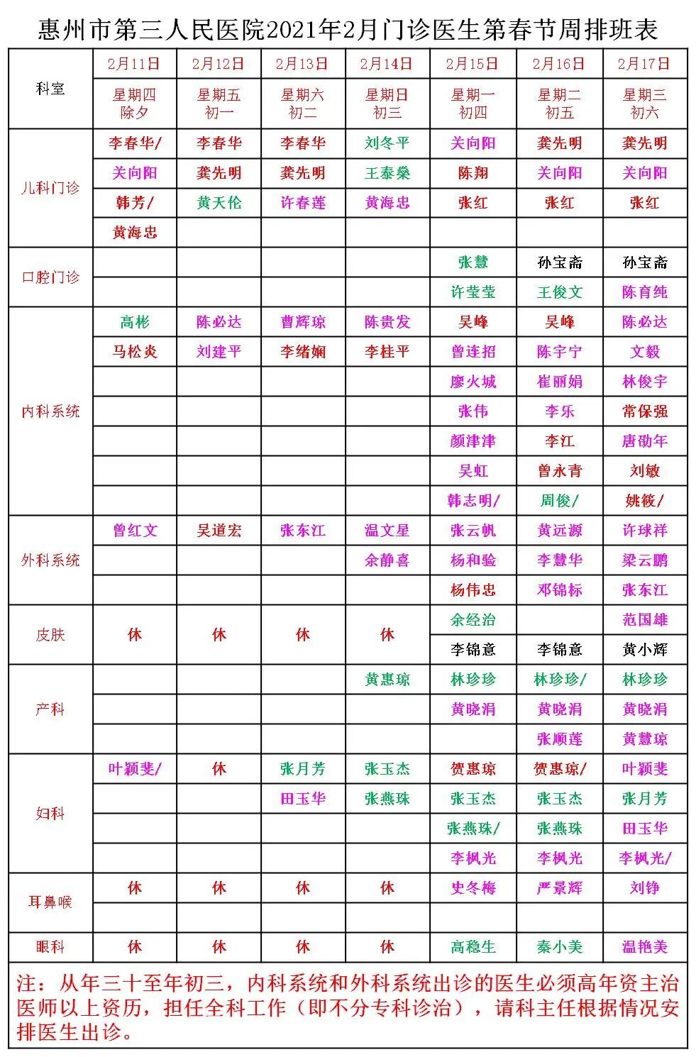 春節(jié)長假期間,惠州市第三人民醫(yī)院門診排班安排如下表所示: