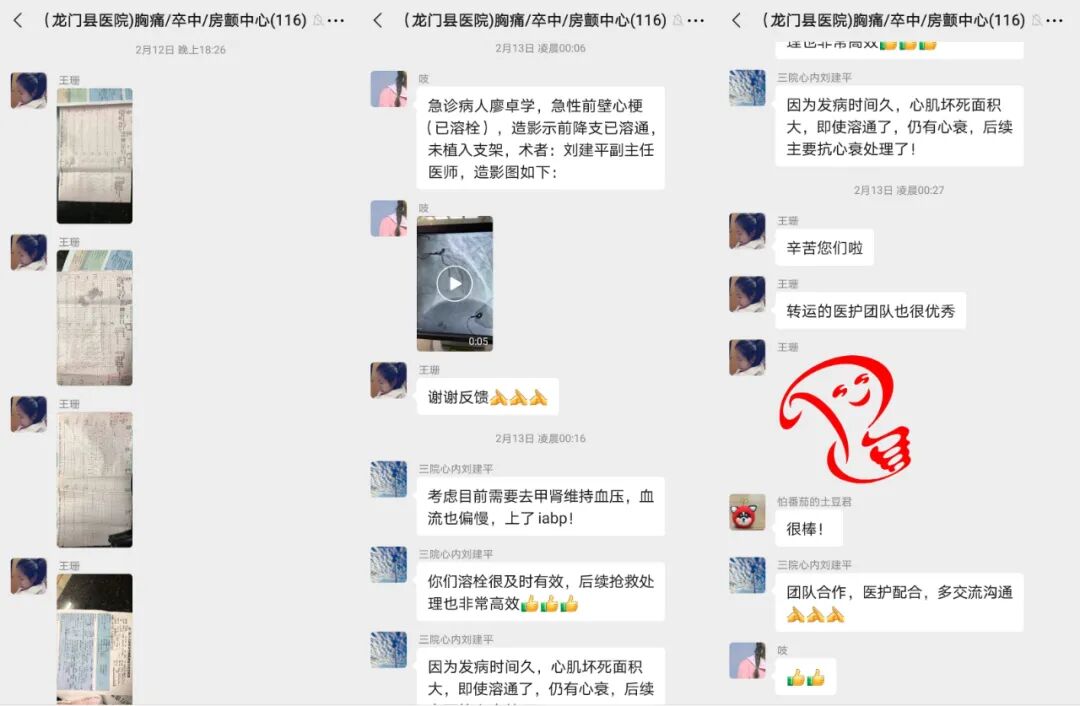 能否轉(zhuǎn)院?還要做什么搶救措施?路途風(fēng)險告知及預(yù)防?各種信息和決策在惠州三院急診醫(yī)學(xué)中心、心血管醫(yī)學(xué)中心心內(nèi)科和龍門縣人民醫(yī)院醫(yī)生間通過電話、微信群迅速傳遞。