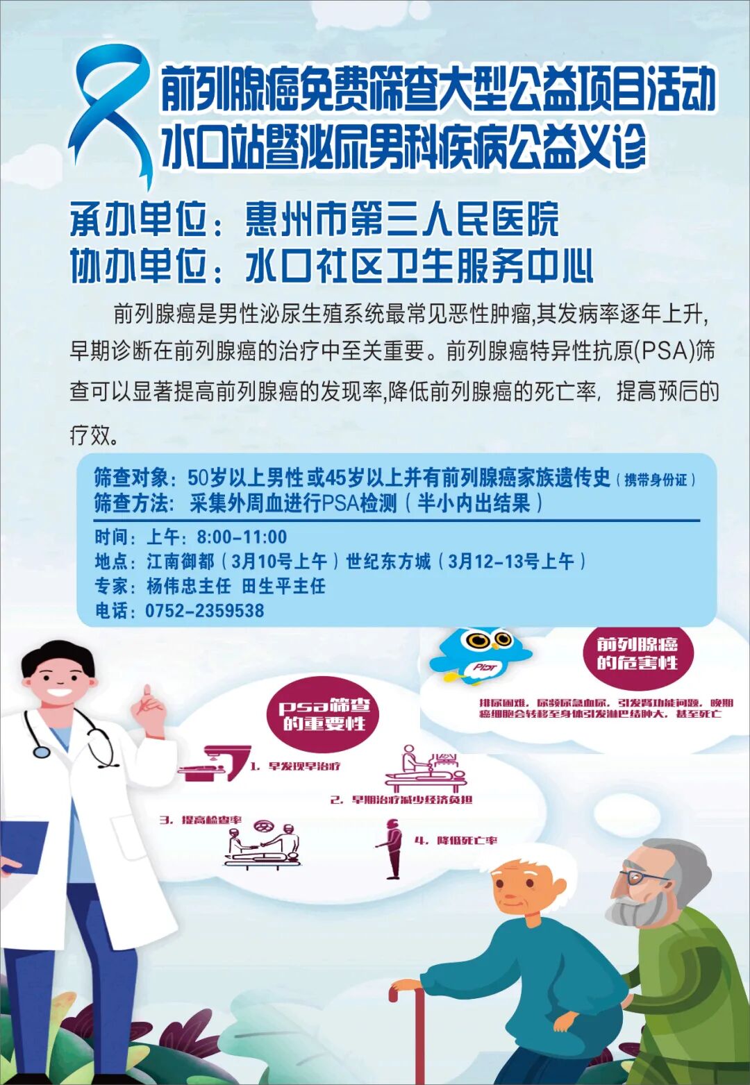 為了提高老百姓對(duì)前列腺癌的認(rèn)識(shí),做到“早發(fā)現(xiàn)、早診斷、早治療”,在惠州市第三人民醫(yī)院社醫(yī)部的指導(dǎo)和協(xié)助下,在水口社區(qū)衛(wèi)生服務(wù)中心的積極響應(yīng)和鼎力支持下,“惠州市惠城區(qū)前列腺癌免費(fèi)篩查大型公益活動(dòng)項(xiàng)目”正式拉開序幕,2021年3月13日上午 8:00-11:00,惠州三院泌尿男科普泌腫瘤組組長(zhǎng)田生平主任醫(yī)師將帶領(lǐng)醫(yī)護(hù)團(tuán)隊(duì)聯(lián)合水口社區(qū)衛(wèi)生服務(wù)中心,深入世紀(jì)東方城社區(qū),舉行前列腺癌免費(fèi)篩查及泌尿男科疾病義診的公益活動(dòng)。