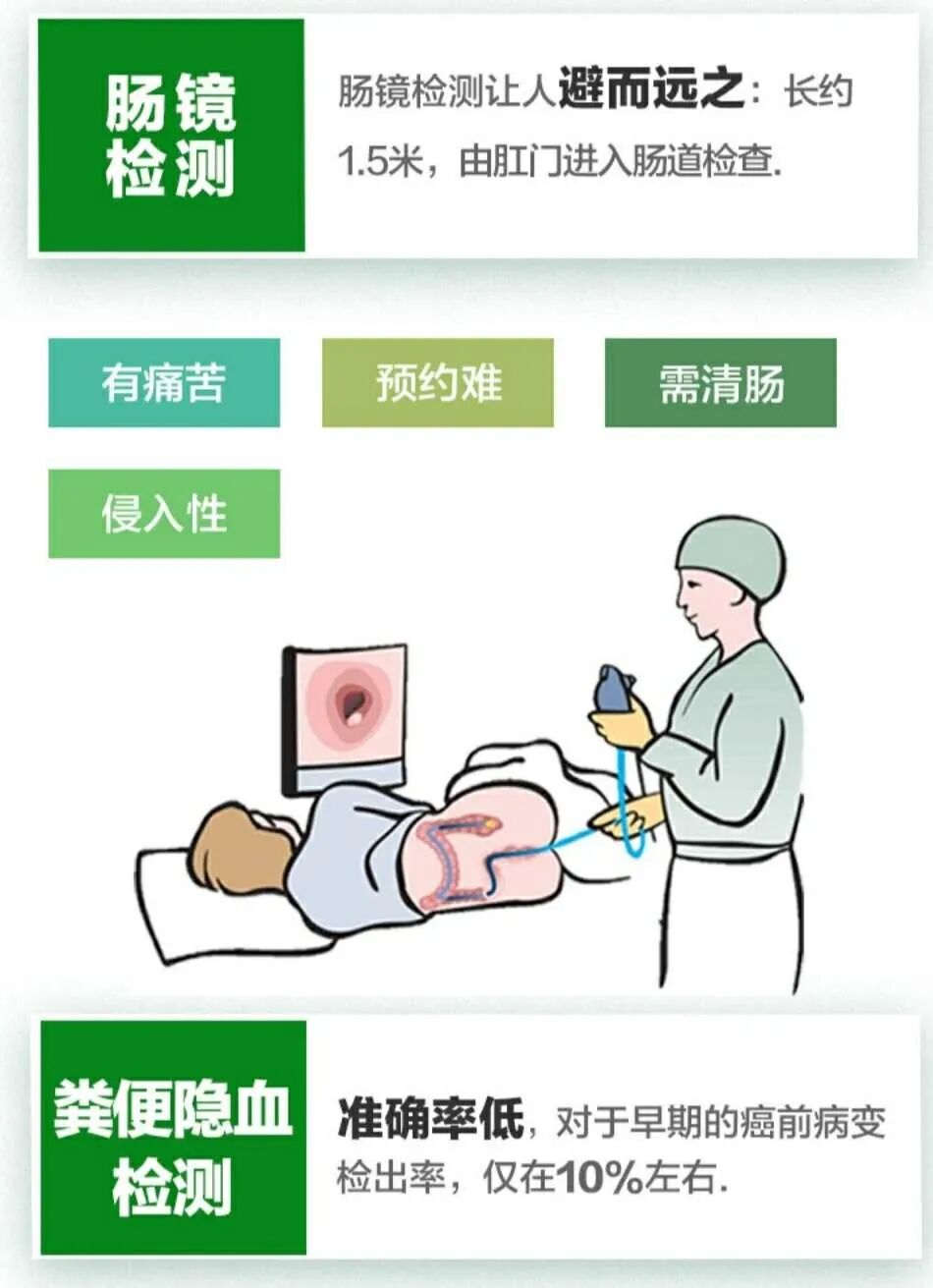 大腸癌目前主要有兩種篩查方法:一是腸鏡檢查,準(zhǔn)確率高,但過程有些痛苦。二是糞便隱血篩查,無創(chuàng)、方便、便宜。