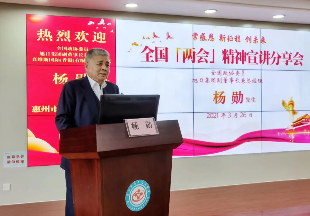 全國政協(xié)委員、旭日集團副董事長兼總經(jīng)理、真維斯國際(香港)有限公司董事長楊勛向在座的廣大醫(yī)療工作者分享了兩會期間的所見所聞、所思所感,并就政府工作報告、十四五規(guī)劃及2035年遠景目標、香港事務(wù)等備受關(guān)注的熱點話題進行深入淺出地解讀。惠州三院領(lǐng)導(dǎo)班子成員、職能部門主任、主管、管理干部基礎(chǔ)班學(xué)員以及醫(yī)護人員代表等近250人參加了本次分享會。