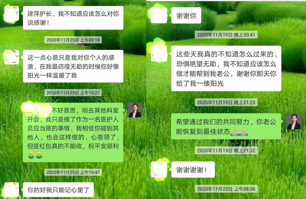 幾個月前,龍門張女士(化名)的丈夫不幸罹患腦出血,病情危重,在得知惠州三院神經(jīng)外科在腦血管疾病方面技術(shù)精湛、深受患者好評,她便希望將丈夫從龍門轉(zhuǎn)到這邊繼續(xù)治療。溫建萍護(hù)士長了解實情后,非常同情張女士一家的遭遇,主動給她留下聯(lián)系方式,事后積極溝通協(xié)調(diào),最終順利將病人接到病區(qū),并給予無微不至的照顧。