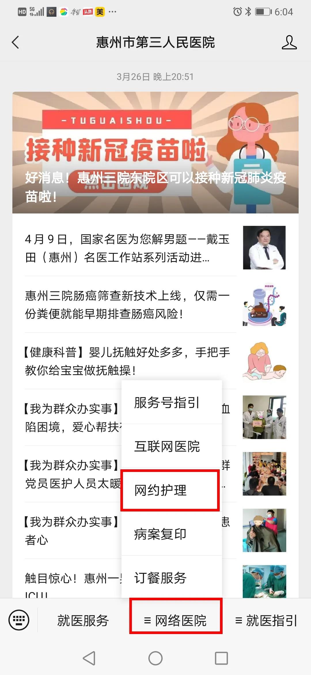 1.關(guān)注“惠州市第三人民醫(yī)院”公眾號,選擇 “網(wǎng)絡(luò)醫(yī)院”- “網(wǎng)約護(hù)理”