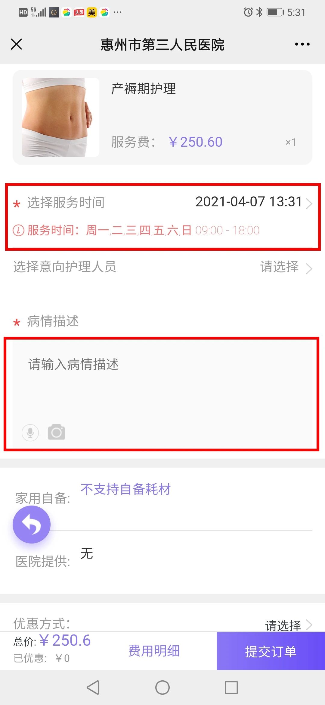 4.填寫患者信息,服務(wù)時間以及患者的病情描述