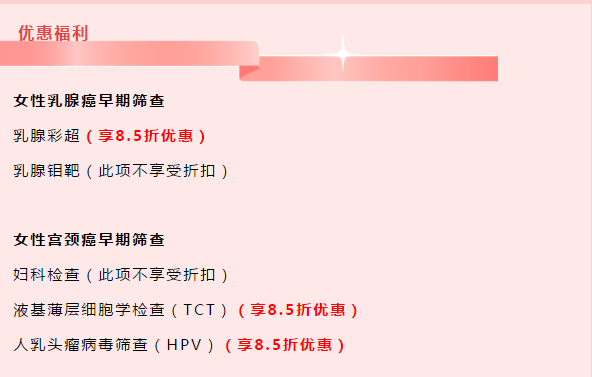 同時,健康管理中心還特別推出腫瘤防治體檢套餐優(yōu)惠活動。如:肺癌的早期篩查、消化道腫瘤篩查、乳腺癌和宮頸癌兩癌篩查、磁控膠囊胃鏡等。有些體檢項(xiàng)目優(yōu)惠享受8.5折!有些低至4.8折?。?/span>材料費(fèi)、藥費(fèi)、已經(jīng)打折的項(xiàng)目及醫(yī)院規(guī)定不打折的項(xiàng)目除外)。