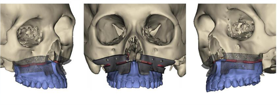 在實(shí)施數(shù)字化正頜手術(shù)之前,醫(yī)護(hù)人員需先根據(jù)患者顱面部數(shù)據(jù)進(jìn)行三維重建和術(shù)前規(guī)劃,并模擬術(shù)后效果;隨后,基于術(shù)前規(guī)劃方案,在計(jì)算機(jī)上設(shè)計(jì)出截骨導(dǎo)板、復(fù)位導(dǎo)板、咬合導(dǎo)板等手術(shù)導(dǎo)板,并通過(guò)3D打印技術(shù)打印出實(shí)體導(dǎo)板;在手術(shù)實(shí)施過(guò)程中,手術(shù)醫(yī)生借助導(dǎo)板實(shí)現(xiàn)精確截骨與復(fù)位,并利用咬合導(dǎo)板準(zhǔn)確就位頜骨,保證正確的咬合關(guān)系。