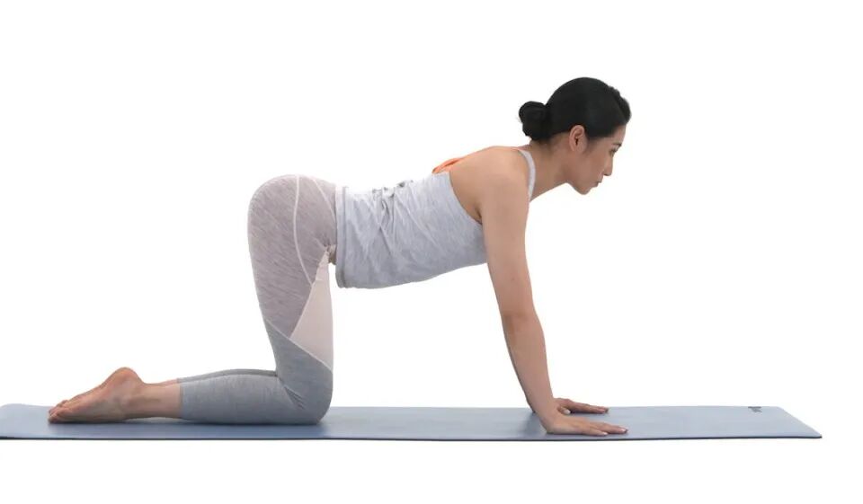 1.貓式伸展:在瑜伽墊上四點支撐,將脊柱向上拱起,保持2秒,隨后再把脊柱下壓,做成“凹”字,保持2秒,循環(huán)12-15次,每天3組。