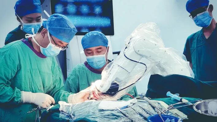 惠州市第三人民醫(yī)院負(fù)責(zé)人、神經(jīng)醫(yī)學(xué)中心主任、神經(jīng)外科學(xué)科帶頭人李雪松(中)利用神經(jīng)外科手術(shù)機(jī)器人為患者手術(shù)。
