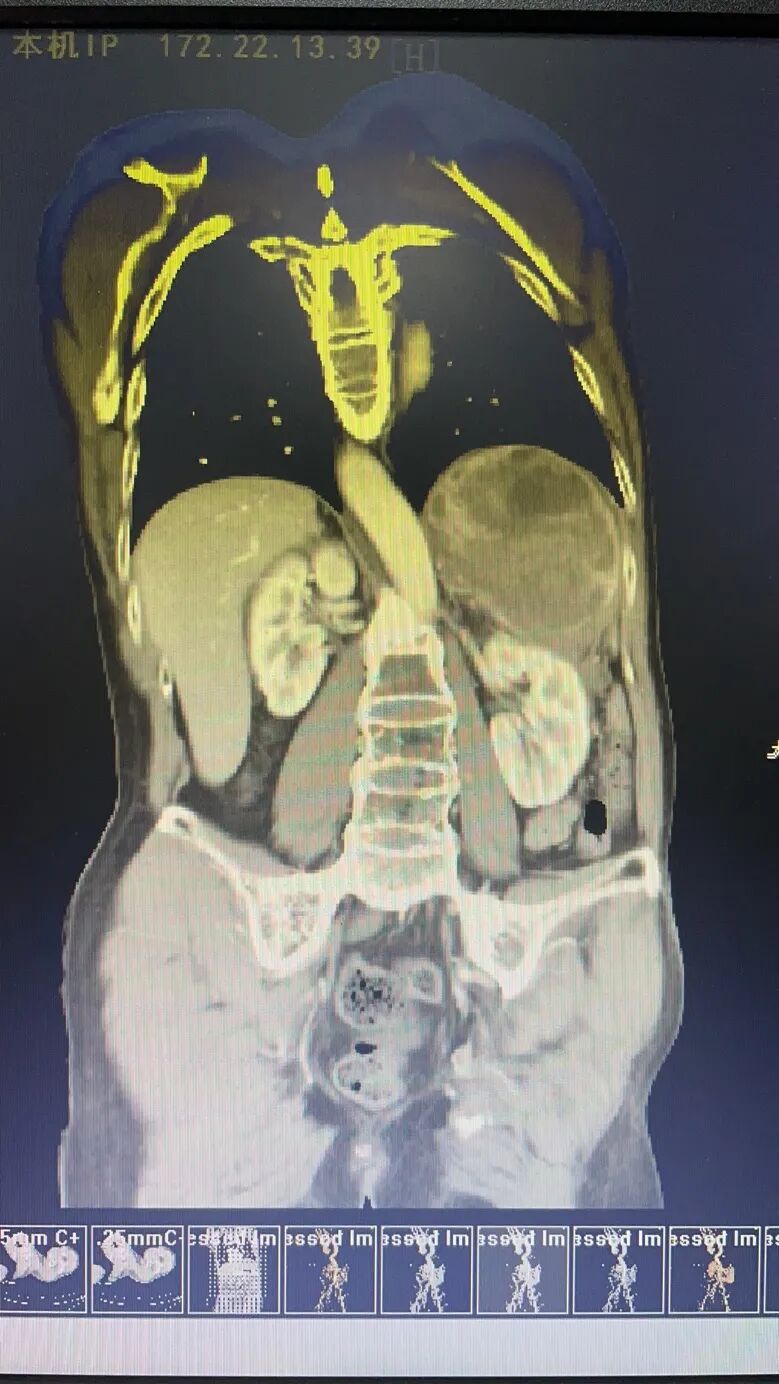 去年12月,56歲的張叔開始感到反復(fù)胸悶、左季肋區(qū)刺痛不適,特別是左上腹有種被壓迫的感覺,不管站著、坐著還是躺著都讓他十分難受,要將枕頭墊很高才能入睡。為此,張叔前來惠州三院急診科就診,測量血壓達到了200/115mmHg。急診科對張叔進行控制血壓治療,但張叔的血壓用普通的降壓藥根本無法控制,只好使用靜脈微泵注射降壓藥控制血壓。完善心肌梗塞、主動脈夾層等相關(guān)檢查未見明顯異常,發(fā)現(xiàn)CT顯示左側(cè)腹膜后有一個巨大腫瘤性占位,最大直徑達到16cm!為了進一步診治,張叔經(jīng)惠州三院泌尿外科會診后被收入了??撇^(qū)。