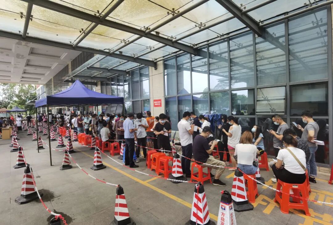 市民在室外等候區(qū)有序排隊,配合工作人員測體溫、查綠碼、核對預約信息等