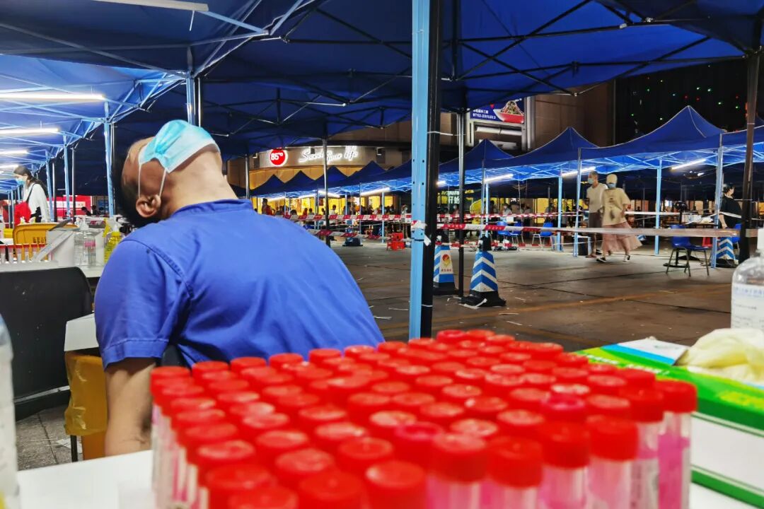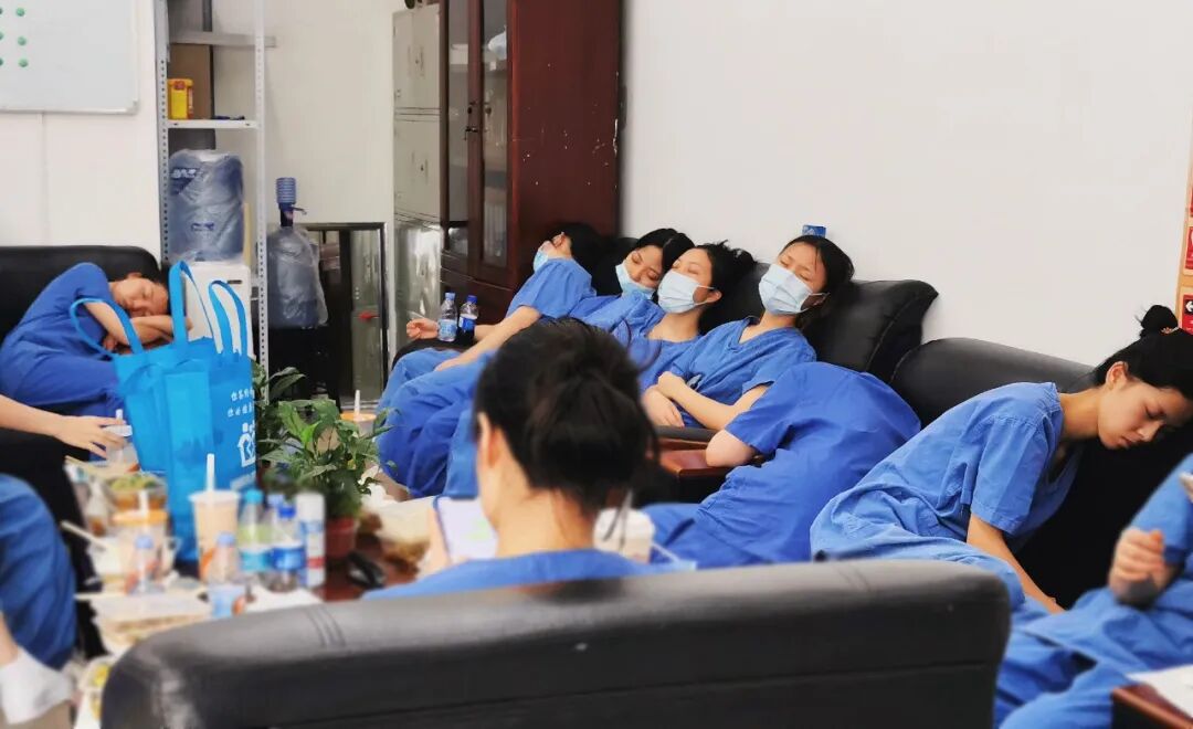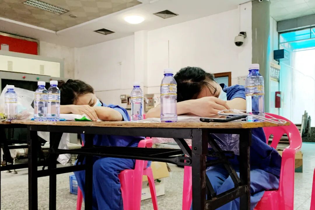 精疲力盡的醫(yī)護人員脫去防護服后仰頭便睡。6月10日晚上10時左右,兩天的緊急采樣任務終于結(jié)束!