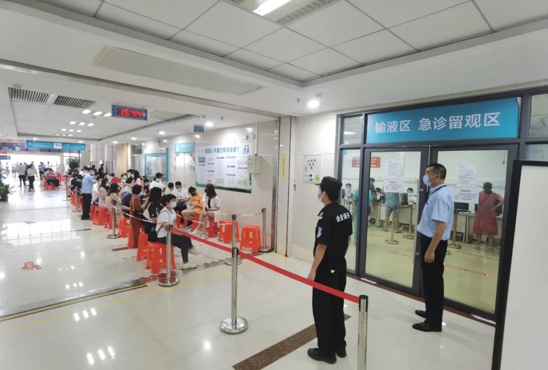 保衛(wèi)科根據(jù)功能分區(qū)設(shè)置隔離帶、拓寬室內(nèi)舒適的等候空間,避免接種者在晴雨不定的六月天日曬雨淋;等候凳按一米線距離整齊固定,保安員在群眾離開(kāi)后,立即調(diào)整凳子,保持安全間隔,等待下一波群眾的到來(lái)。
