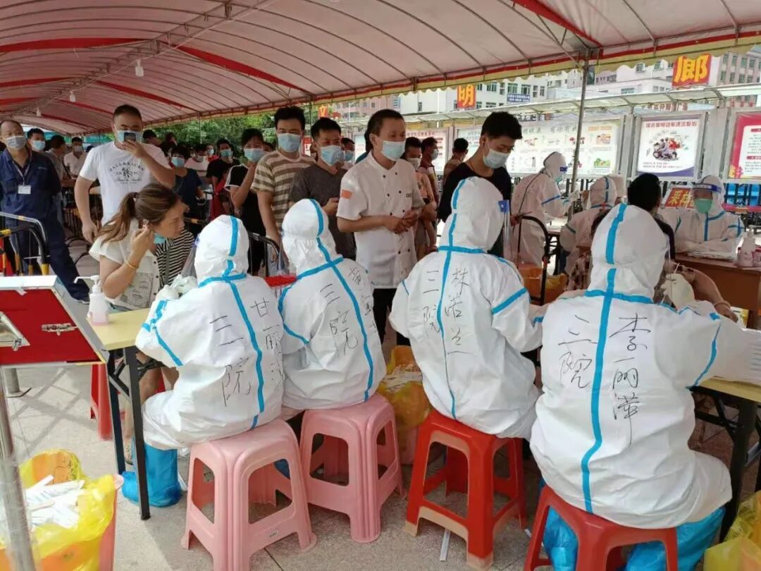 在社區(qū)、警察、志愿者、鎮(zhèn)街村干部的通力協(xié)作下,6月22日晚上12點,所有采集點的采集任務終于圓滿高效地完成。當大家脫下防護服,一身“濕衣”令人動容,疲憊的臉上露出了欣慰的笑容。