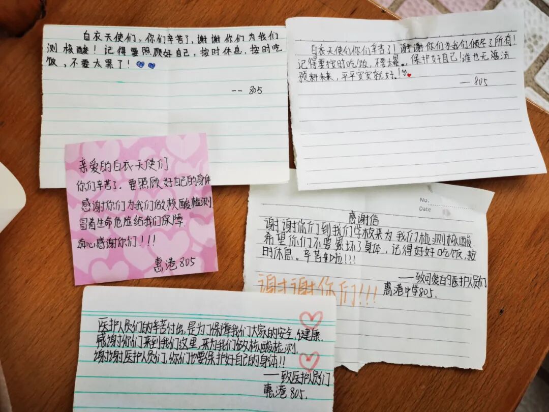 這一天依舊是汗流浹背的一天,疲憊不堪的一天,但也是動人心弦的一天。除了手勢舞和鮮花,采樣醫(yī)護(hù)人員還收到了一些特殊的禮物。惠港中學(xué)的學(xué)生用手中的畫筆,畫出了心中的天使,其他中學(xué)的同學(xué)送來了很多感謝信。