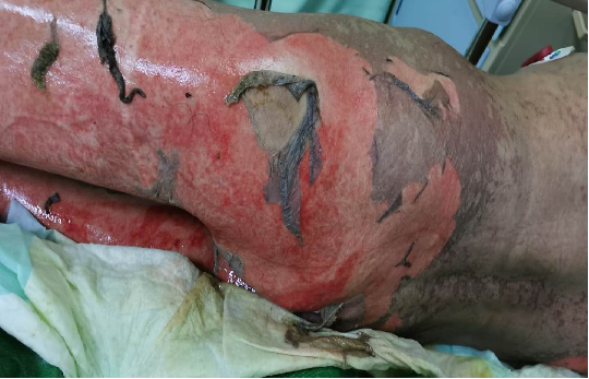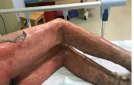 這是一位50來歲的特殊患者,病情嚴重,患的是藥物性大皰性表皮松解壞死型皮炎。他沒有家屬也沒有陪護,屬于“三無”人員。剛?cè)朐旱臅r候,他全身皮膚都是片狀充血性紅色皮疹,還伴有大量水皰和滲液,散發(fā)出一陣難以描述的氣味。可能是因為疾病的折磨還是其他原因,他性格孤僻,脾氣暴躁,且依從性差,不配合治療。