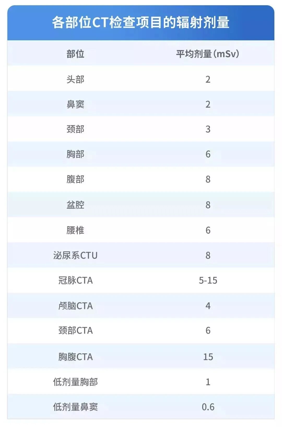 根據(jù)國家發(fā)布的《X射線計算機斷層攝影成年人診斷參考水平》,小編整理了一份表格,人體各部位CT檢查項目的輻射量,一看便知。