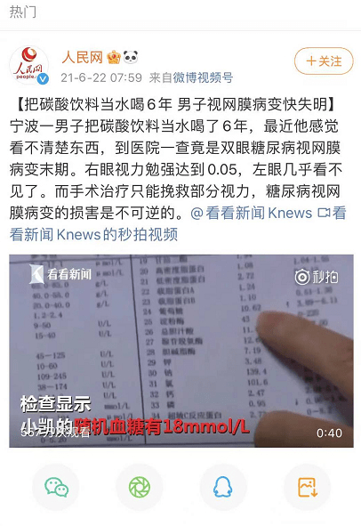 前段時(shí)間,一名25歲的年輕男子將碳酸飲料當(dāng)水喝了6年,再加上平時(shí)飲食不規(guī)律,視力越來(lái)越差,到醫(yī)院一查竟是雙眼糖尿病視網(wǎng)膜病變末期。他右眼視力勉強(qiáng)達(dá)到0.05,左眼幾乎失明。
