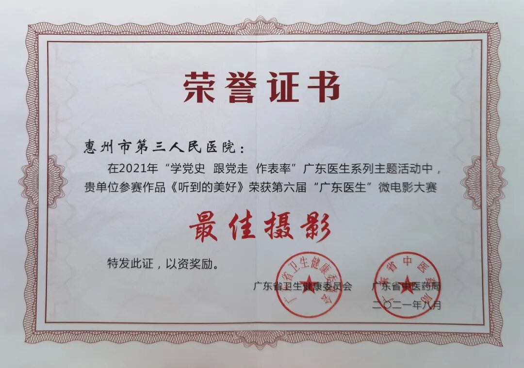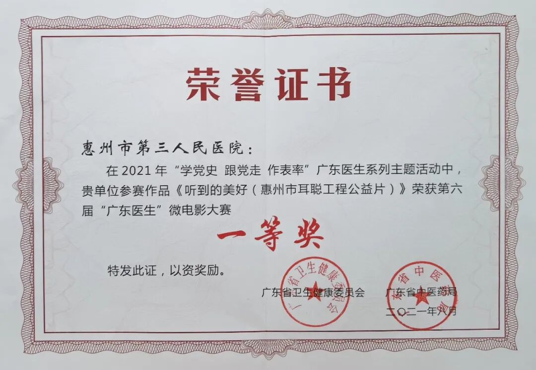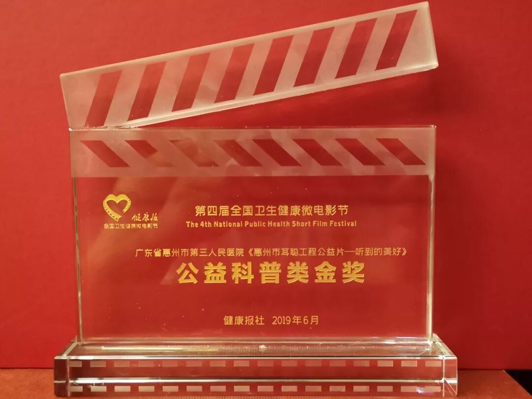 時(shí)間的指針撥回到2019年6月,惠州三院耳聰工程公益片《聽(tīng)到的美好》在第四屆全國(guó)衛(wèi)生健康微電影節(jié)上,從120部入圍作品中脫穎而出,榮獲最高獎(jiǎng)——金獎(jiǎng)!