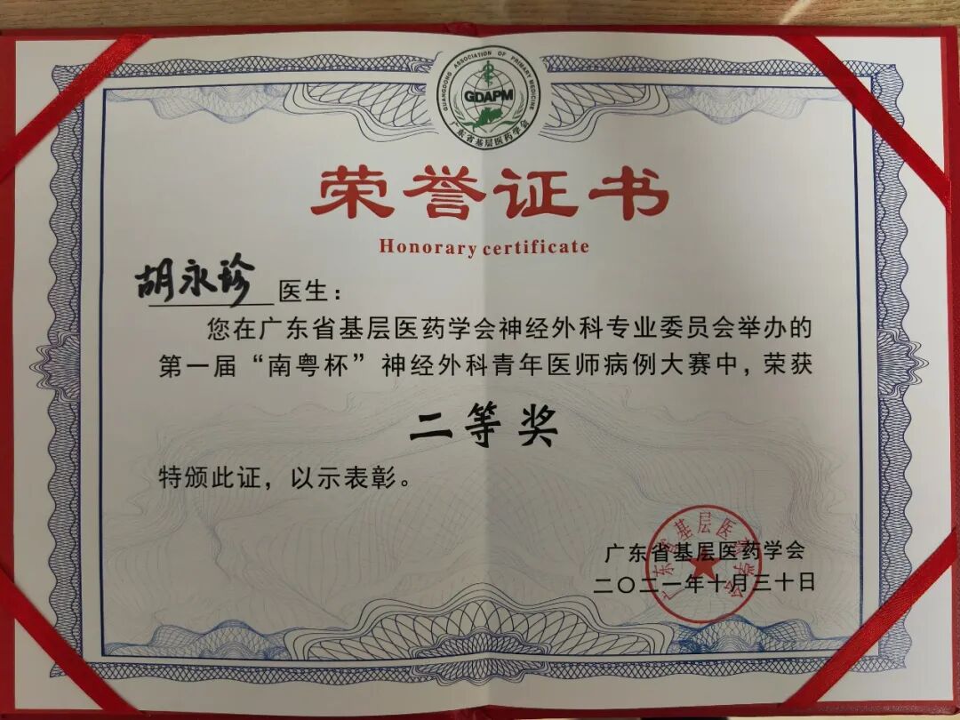 近日,在廣東省基層醫(yī)藥學(xué)會(huì)神經(jīng)外科專委會(huì)和廣東省醫(yī)學(xué)會(huì)基層技術(shù)推廣學(xué)組共同舉辦的第一屆“南粵杯”神經(jīng)外科青年醫(yī)師病例大賽上,惠州三院神經(jīng)醫(yī)學(xué)中心神經(jīng)外科胡永珍醫(yī)生榮獲二等獎(jiǎng)!