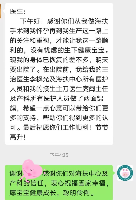 在醫(yī)護(hù)人員的安排下,廖女士做了全面檢查評估,于2020年10月16日順利進(jìn)行了“海扶刀”手術(shù)。術(shù)后第二天,廖女士便出了院。術(shù)后3個月,醫(yī)護(hù)人員就收到了廖女士順利懷孕的好消息,孕期狀態(tài)良好,并在我院產(chǎn)科專家指導(dǎo)下定期產(chǎn)檢。
