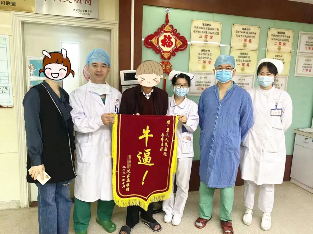 出院時,羅大爺?shù)呐畠河H自為泌尿腫瘤醫(yī)護(hù)團(tuán)隊(duì)送來了一面錦旗,錦旗上寫著的“牛逼”二字格外醒目。羅大爺?shù)呐畠赫f:“我現(xiàn)在所有的情感只能用這兩個字來表達(dá)!”