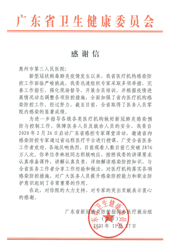 近日,惠州市第三人民醫(yī)院收到一封來(lái)自廣東省衛(wèi)健委的感謝信。感謝信中寫(xiě)道: