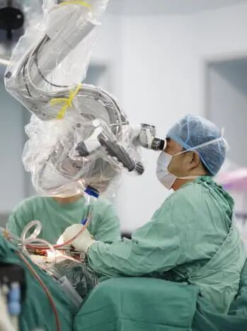 惠州三院負(fù)責(zé)人、神經(jīng)醫(yī)學(xué)中心主任兼神經(jīng)外科學(xué)科帶頭人李雪松博士使用顯微鏡為患者手術(shù)
