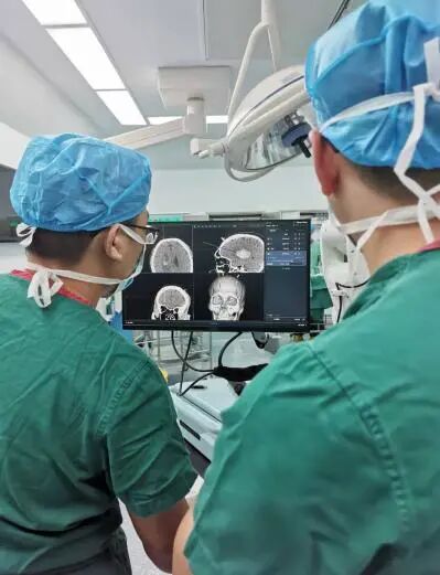 神經(jīng)醫(yī)學(xué)中心主任助理余永強(qiáng)主任醫(yī)師聯(lián)合立體定向加方體畫線定向軟管技術(shù)行腦干出血微創(chuàng)穿刺引流術(shù)