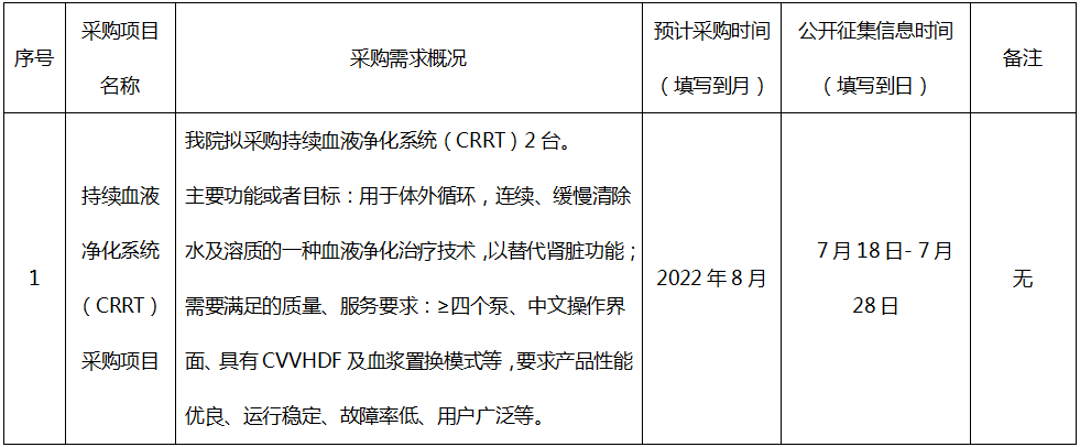 持續(xù)血液凈化系統(tǒng)(CRRT)采購意向征集公告