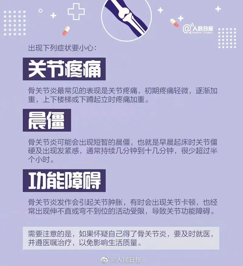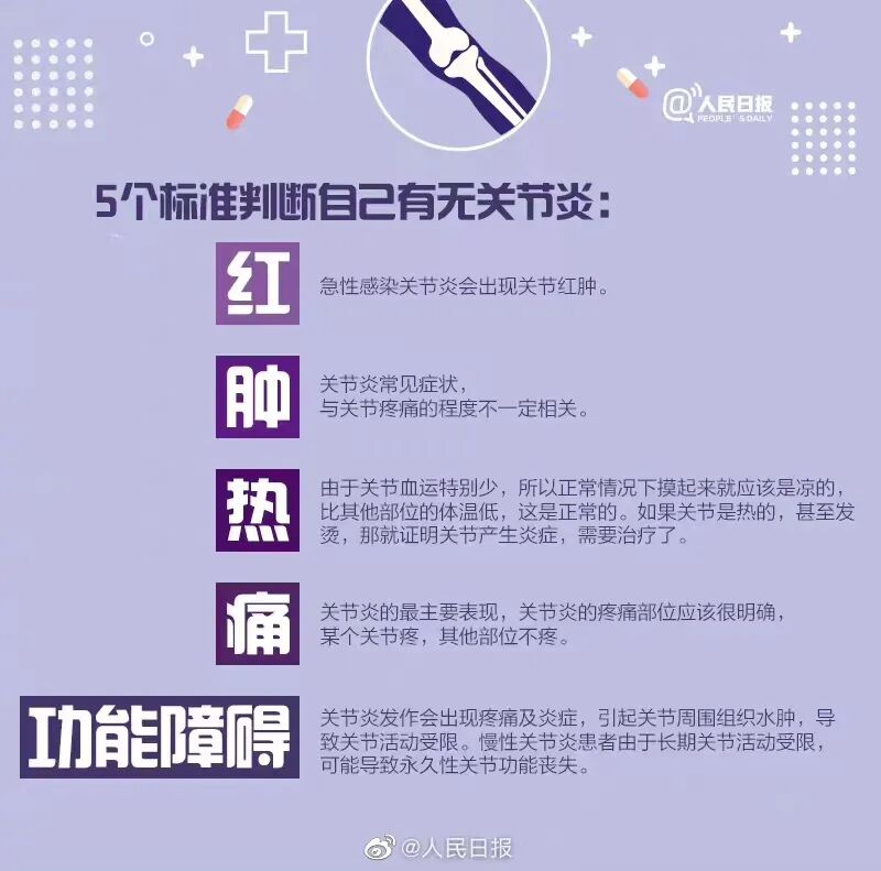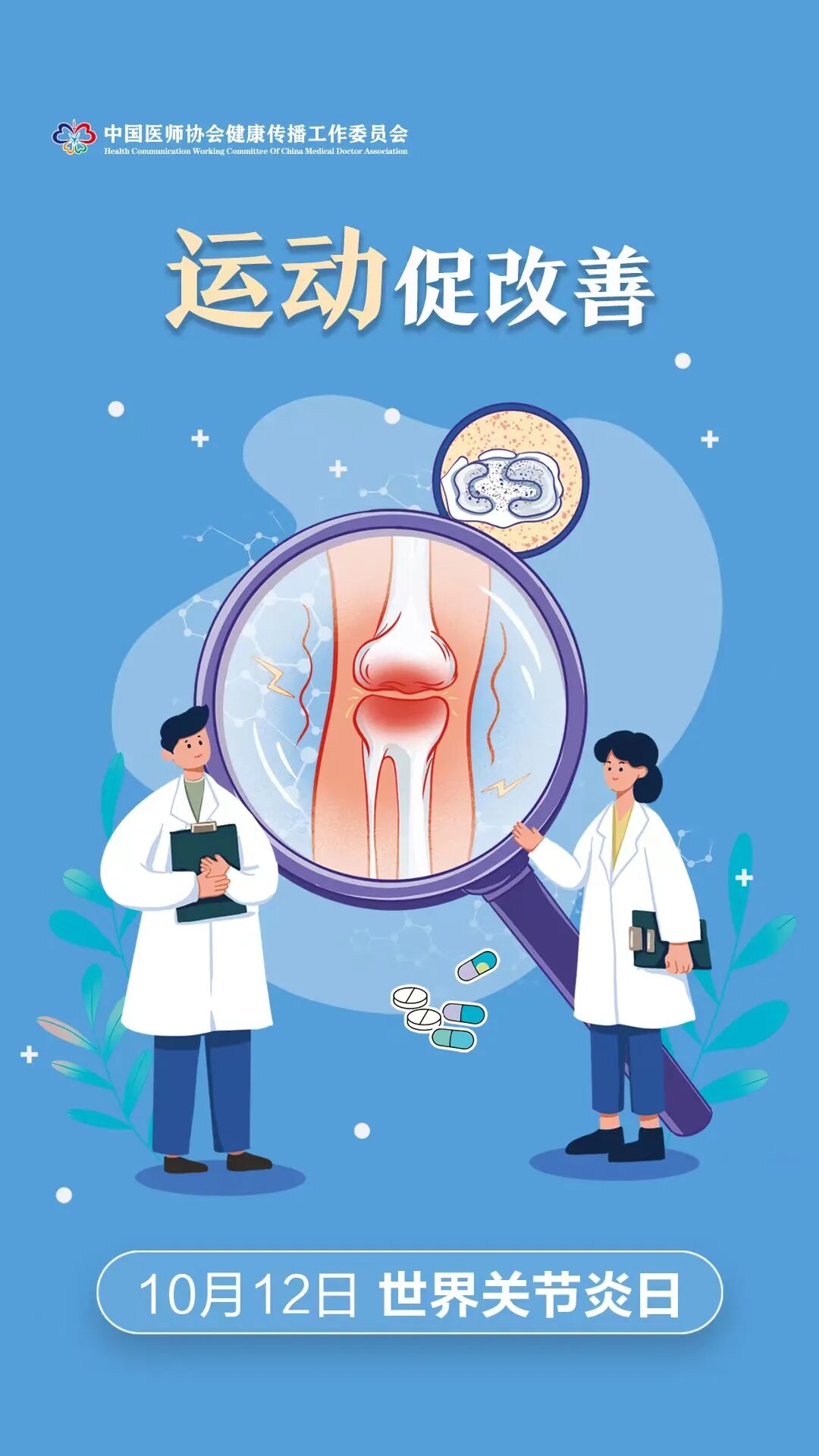 “世界關(guān)節(jié)炎日”定于每年的10月12日,設(shè)立“世界關(guān)節(jié)炎日”的目的就是要提醒人們,平時(shí)出現(xiàn)關(guān)節(jié)相應(yīng)癥狀,對(duì)關(guān)節(jié)炎要早預(yù)防、早診斷、早治療,防止致殘!