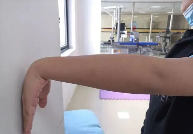 主動牽拉:肘關節(jié)伸直,腕關節(jié)屈曲,感覺前臂伸肌有牽拉感,但是不產生疼痛,在此姿勢下保持20s,重復3次,每天可重復5-15次。