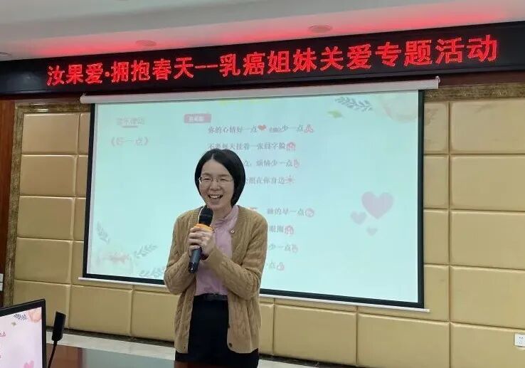 活動(dòng)伊始,節(jié)奏歡快的音樂律動(dòng)烘亮了整個(gè)會(huì)場,醫(yī)護(hù)人員和病友們沉浸在美好愉悅的氛圍里。為表達(dá)對(duì)乳腺科醫(yī)護(hù)人員的感謝和病友們的支持,病友黃女士為大家傾情演唱《軍中綠花》。這時(shí),社工科主任王冬生和剛做完手術(shù)的乳腺科主任鄧素華來到了會(huì)場,為病友們送上誠摯的祝福。