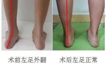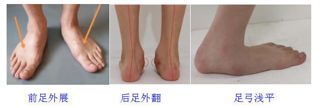 從外觀上觀察,孩子的足部出現(xiàn)以下變化:前足外展,后足外翻,足弓扁平,足部內側突出等。
