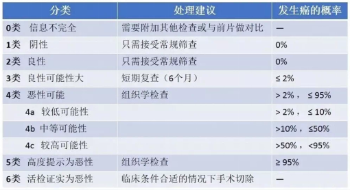 鉬靶報告出來后,常常會有“1類”、“2類”、“4a”這樣的字眼,這究竟是什么意思呢?看看下面這張圖就明白了。