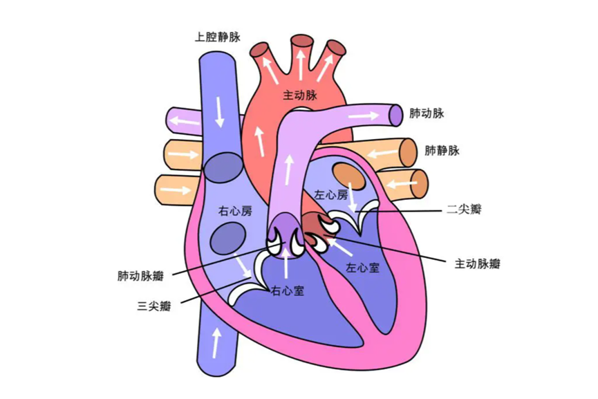正常人的心臟在胸骨的后側(cè)偏向左的位置,相當于每個成年人自己拳頭的大小,大約重300克。心臟就像一所四居室的房子,左右心房之間和左右心室之間均由間隔隔開,也就是說房和房之間、室和室之間是互不相通的。而心房與心室之間有“門”——瓣膜,這些瓣膜使心房和心室之間形成了“單向通道”,血液只能從心房流入心室而不能倒流。