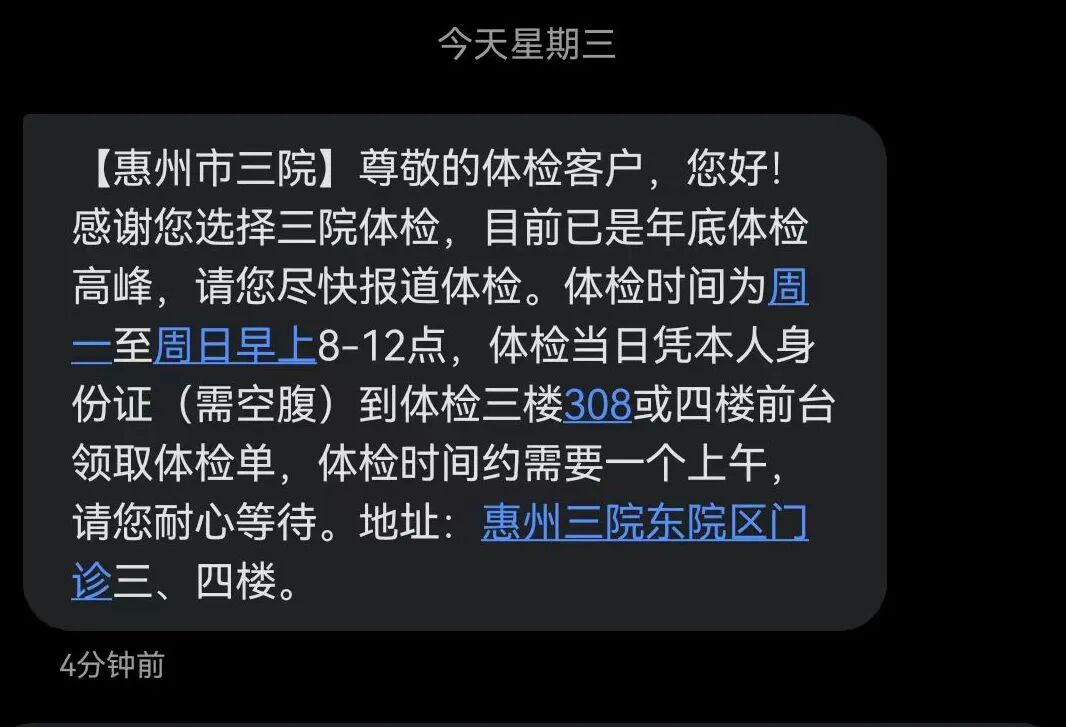 請?zhí)崆?-2個工作日預(yù)約。您可以關(guān)注“惠州三院健康管理中心”微信公眾號—我要體檢—選擇個人或團體預(yù)約—選擇體檢日期,進行預(yù)約。