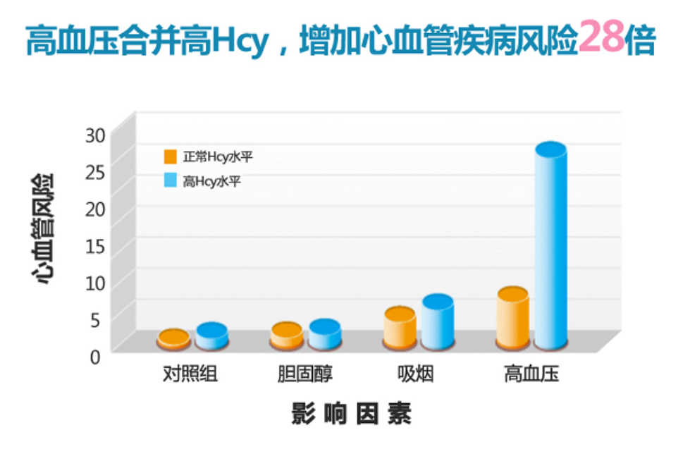 歐洲一項揭示Hcy與傳統(tǒng)危險因素并存時對血管疾病交互作用的大樣本流行病學研究發(fā)現(xiàn),當高血壓和高Hcy并存時(即H型高血壓時),人體發(fā)生心腦血管疾病風險比普通人增加28倍,比單純的高血壓患者高5-8倍。