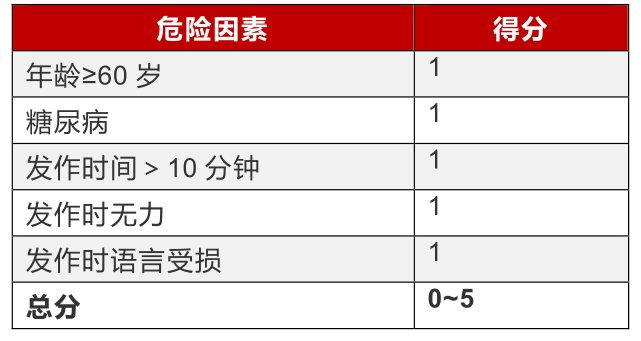 TIA短期(90天)腦卒中風(fēng)險(xiǎn)評(píng)分包含5項(xiàng)危險(xiǎn)因素,總分0~5分,不同分值對(duì)應(yīng)的90天內(nèi)腦卒中風(fēng)險(xiǎn)為: