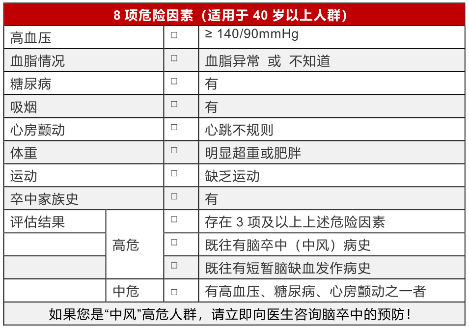 “腦卒中”危險(xiǎn)評(píng)分卡適用于40歲以上人群,由8大危險(xiǎn)因素加腦卒中病史組成。8大危險(xiǎn)因素包括高血壓、血脂異常、糖尿病、吸煙、心房顫動(dòng)、超重或肥胖、缺乏運(yùn)動(dòng)、腦卒中家族史。詳見(jiàn)下表。
