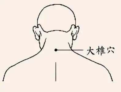 取穴:取俯臥位或坐位,低頭,可見(jiàn)頸背部交界處椎骨有一高突處,即是第7頸椎,其棘突下凹陷處即為此穴。