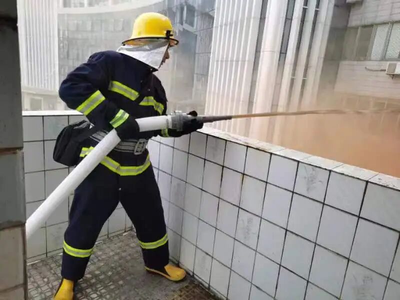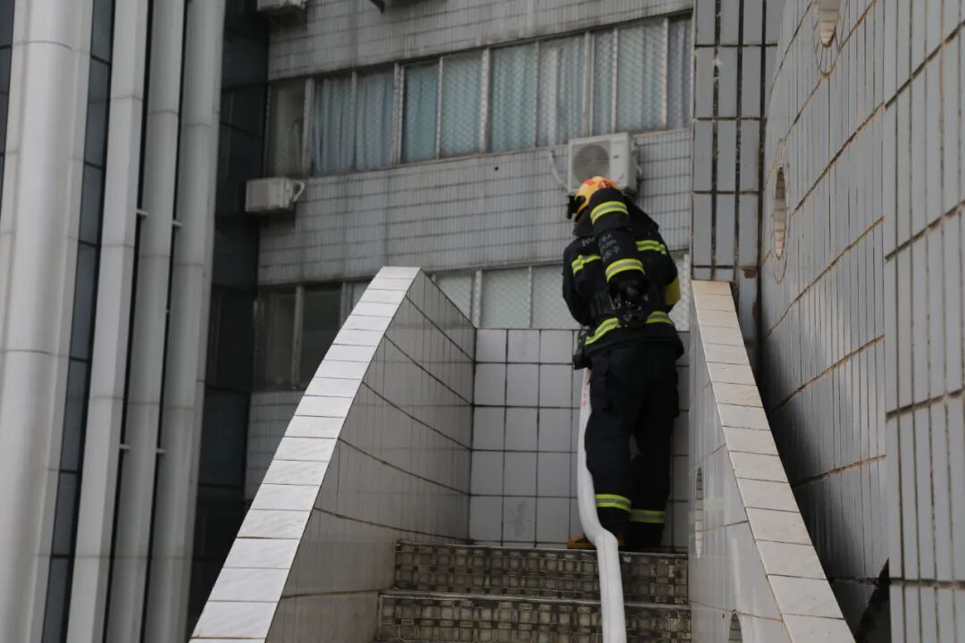 東平消防救援站接報警后十分鐘兩臺消防車到達火災(zāi)現(xiàn)場,一臺向6號樓三樓著火樓層噴水滅火,一臺車向蔓延樓層噴水。