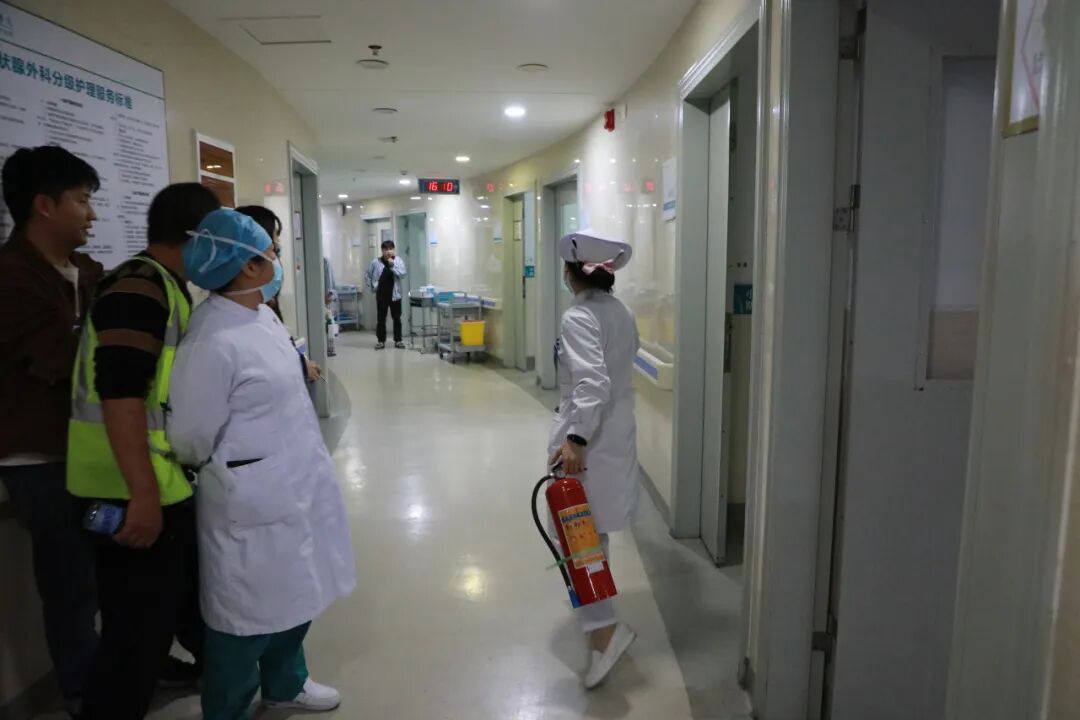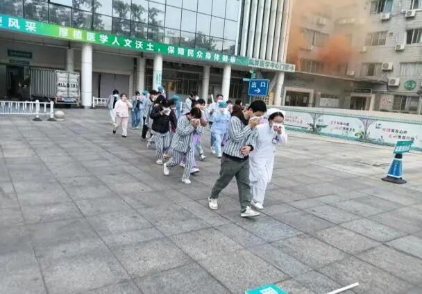 隨著警報聲響起,在場醫(yī)護人員指導(dǎo)病人用濕毛巾或衣服捂住口鼻,彎腰有秩序地從各病區(qū)迅速撤離,整個疏散過程快而有序。經(jīng)過詳細(xì)清點人數(shù),疏散中無一(參演)病人遺留在病房,疏散中也無一病人出現(xiàn)傷情,安全到達指定集合點。